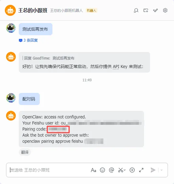 给 已配置好的机器人 发送配对码。