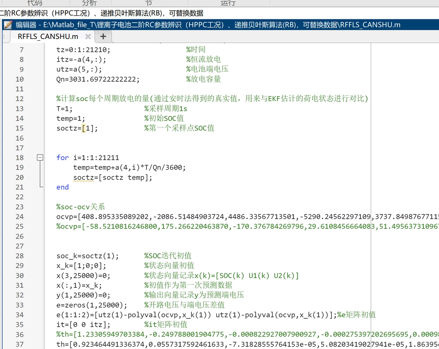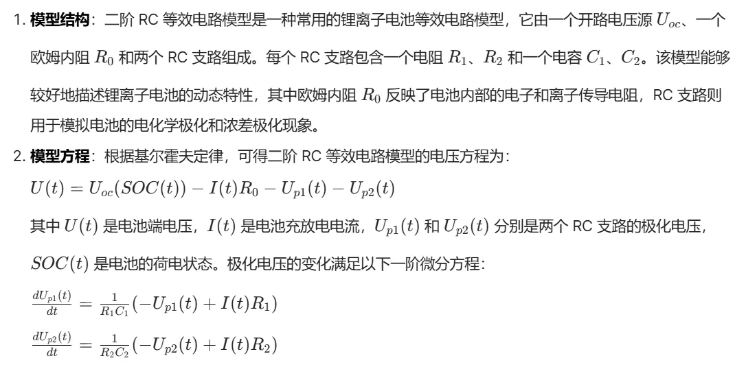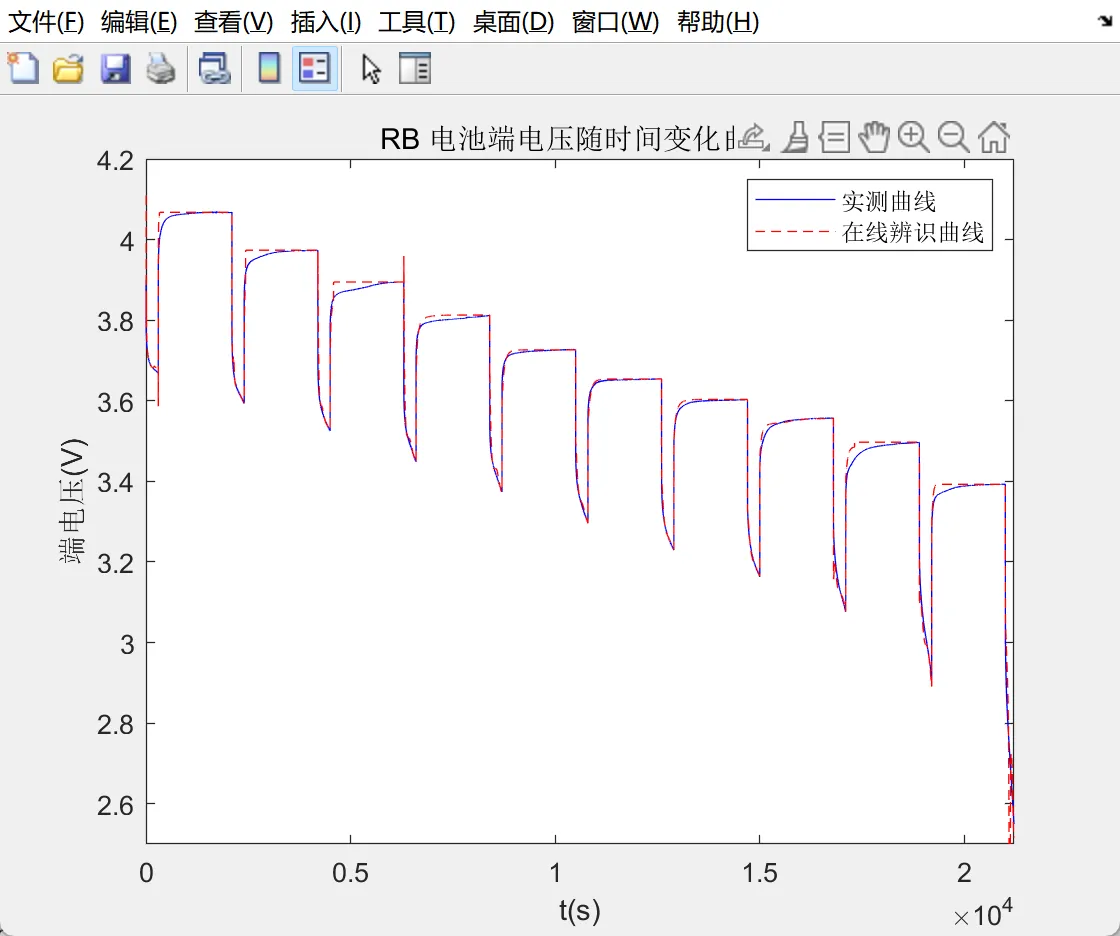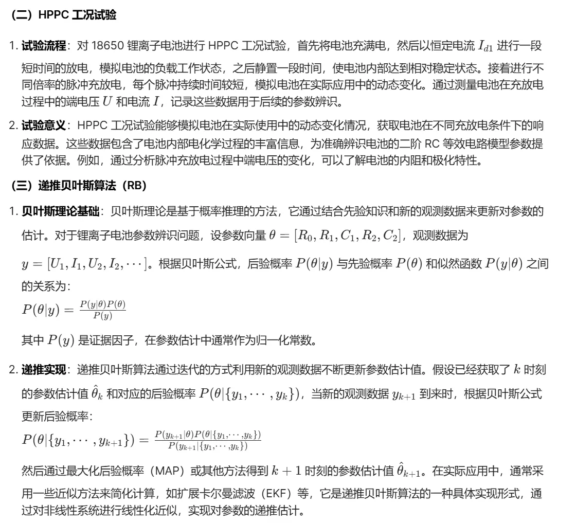 递推贝叶斯算法(RB)是一种基于贝叶斯理论的在线参数估计方法,它能够利用新获取的数据不断更新参数估计值,具有实时性好、对噪声鲁棒性强等优点。HPPC(Hybrid Pulse Power Characterization)工况模拟了电池在实际应用中的动态充放电过程,通过一系列的脉冲充放电试验,可以获取丰富的电池动态响应信息。将递推贝叶斯算法应用于 HPPC 工况下的锂离子电池参数辨识,能够充分利用 HPPC 试验数据的动态特性,实时准确地估计电池的二阶 RC 等效电路模型参数。