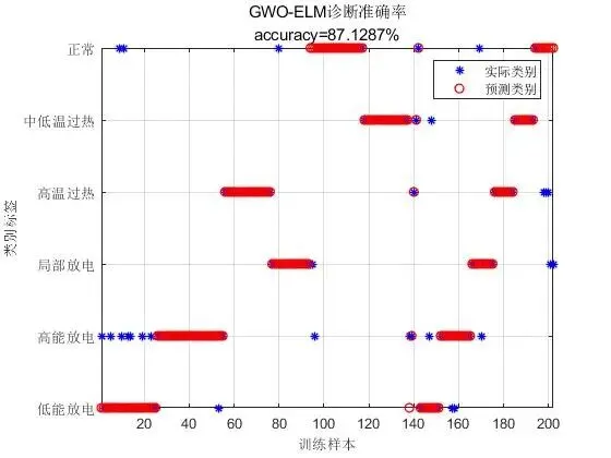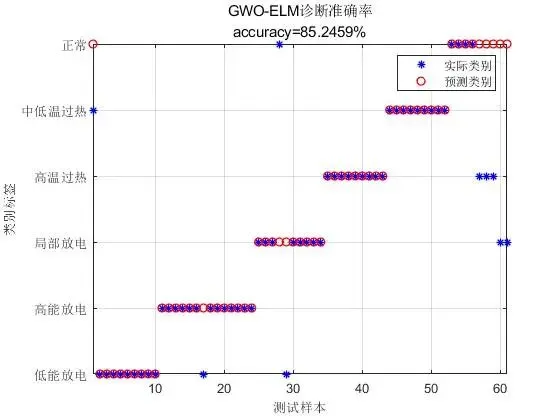 - 故障诊断与评估:使用优化后的 ELM 模型对测试集进行变压器故障诊断。通过计算诊断准确率、召回率、F1 值等评估指标,对诊断结果进行评估,以衡量 GWO - ELM 模型在变压器故障诊断中的性能表现。与传统故障诊断方法或未经过优化的 ELM 模型相比,验证 GWO - ELM 模型在提高诊断准确率、降低误判率等方面的优势。