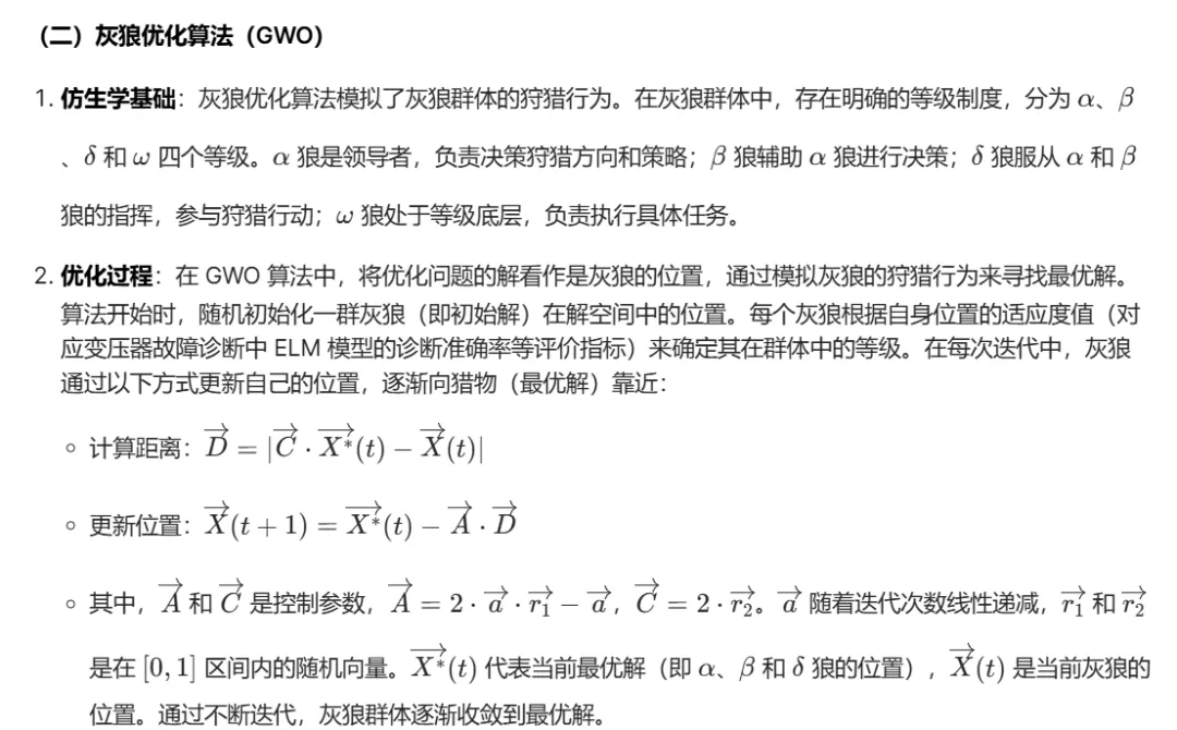 - GWO 优化 ELM 参数:将 ELM 模型的参数(如隐含层神经元个数、输入层到隐含层的连接权重等)编码为灰狼的位置。利用 GWO 算法对这些参数进行优化。对于每只灰狼(即一组 ELM 参数),构建对应的 ELM 模型,并在训练集上进行训练和验证。计算模型在验证集上的诊断准确率、召回率等适应度值,根据适应度值更新灰狼的位置,使 GWO 算法朝着提高 ELM 模型性能的方向搜索最优参数。通过不断迭代,找到最优的 ELM 模型参数。