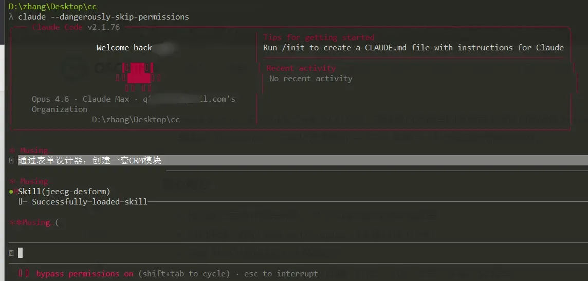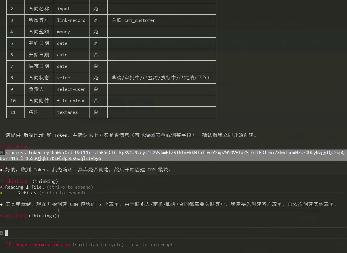 在 Claude Code 中输入指令:通过表单设计器,创建一套CRM模块,然后静待 AI 完成全部工作即可。