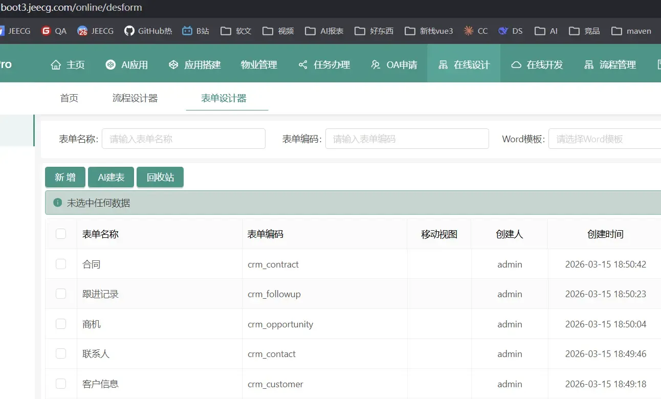将表单部署到 JeecgBoot低代码系统后,直接就能在前端页面中看到完整的业务模块: