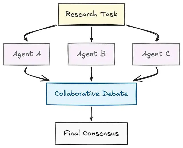 第二种:Peer Agents(对等辩论/协作)。多个 Agent 独立处理同一任务,之后对比各自的结论,这个类似于研究者之间通过辩论逼近真相的过程。在对精度要求极高的任务中,这种模式尤其有价值。