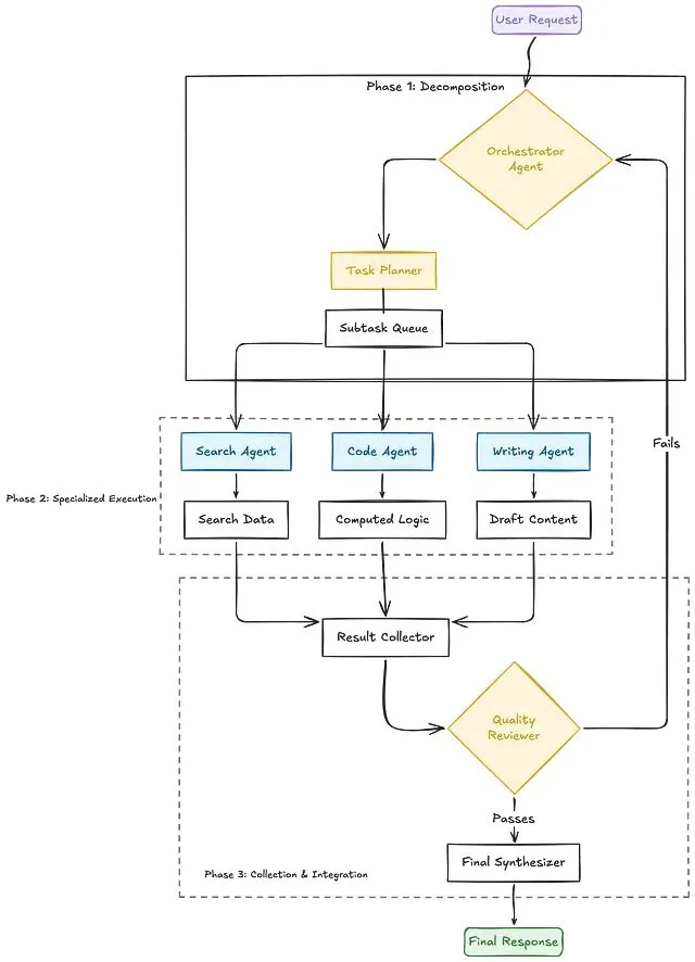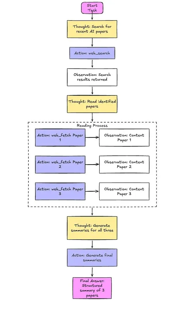 它把一个静态的语言模型改造成动态推理引擎:将复杂任务拆解为多个简单子任务,再由多 Agent 协作逐一完成。在这个过程中,Agent 可以调用外部工具、校验自身输出、与其他 Agent 协同工作——单轮提示根本不可能覆盖这些场景。