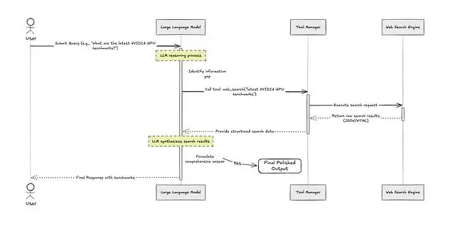 Tool Use(也叫 Function Calling)的基本流程是这样的:Agent 收到任务后判断是否需要借助外部工具;如果需要,生成一个结构化的工具调用请求;工具执行后返回结果;Agent 将结果纳入推理链继续处理。