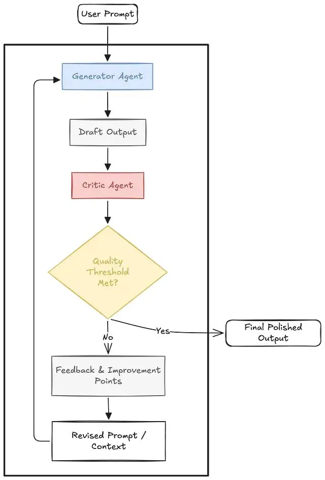 最简单的形态下,Reflection 是一个两步循环。第一步,Agent 生成初始输出(代码、文章、研究报告等);第二步,同一个 Agent 或另一个专职"评审"Agent 对输出进行分析,识别缺陷和可改进之处。这个循环可以反复执行,直到输出质量达到预设阈值。
