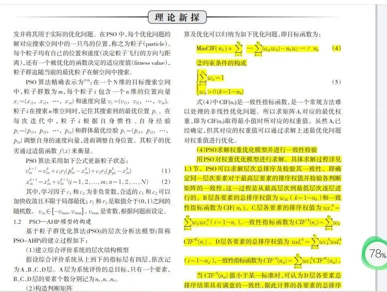 将 PSO 与 AHP 结合,可以有效解决 AHP 中判断矩阵一致性的问题,从而提高权重确定的准确性。