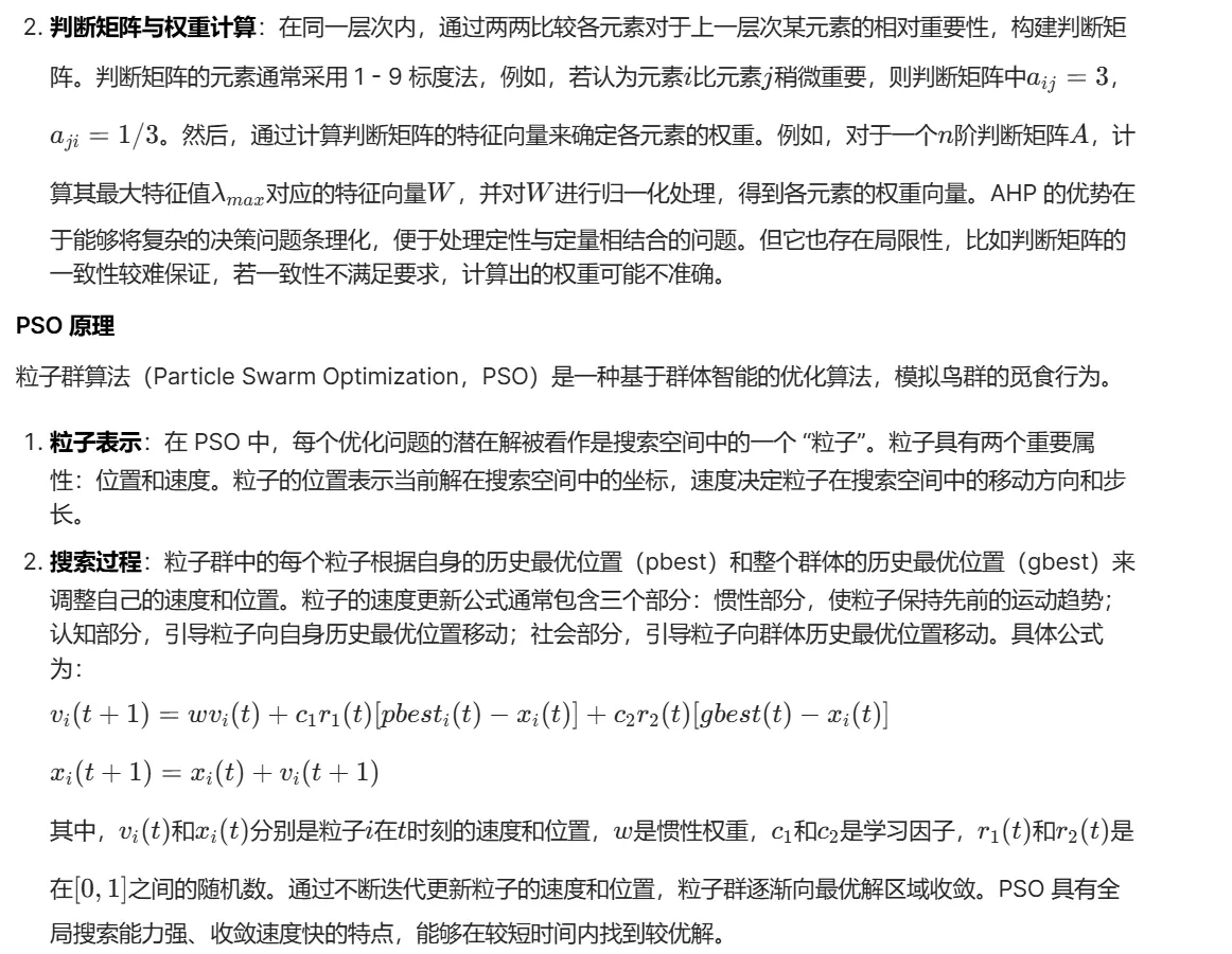 - 结合思路:利用 PSO 对 AHP 中的判断矩阵元素进行优化。PSO 的粒子位置可以对应判断矩阵的元素,通过调整粒子位置(即判断矩阵元素),使判断矩阵更符合一致性要求。