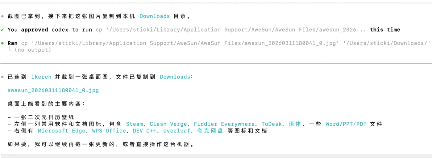 这时候你能明显看出来,它不是在那一本正经地“脑补答案”,而是真的开始做事了:先找设备,再发起远程连接,然后截一张屏回来,最后再根据截图内容告诉我桌面上有什么。