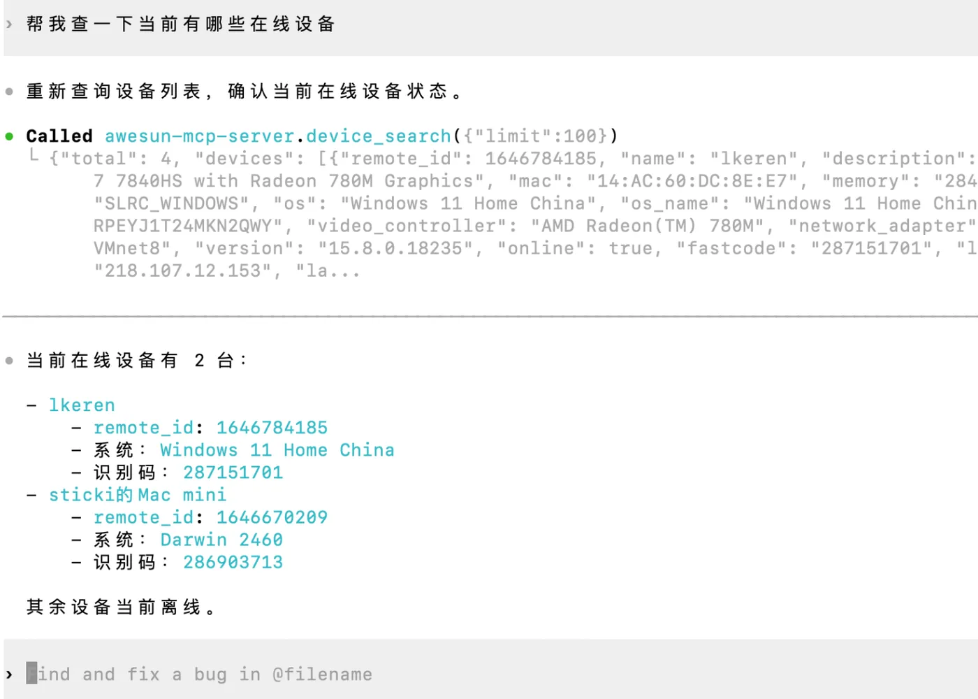 如果 AI 能把设备列表和在线状态回出来,说明这条链路已经通了。正常来说,这一套配下来用不了多久。