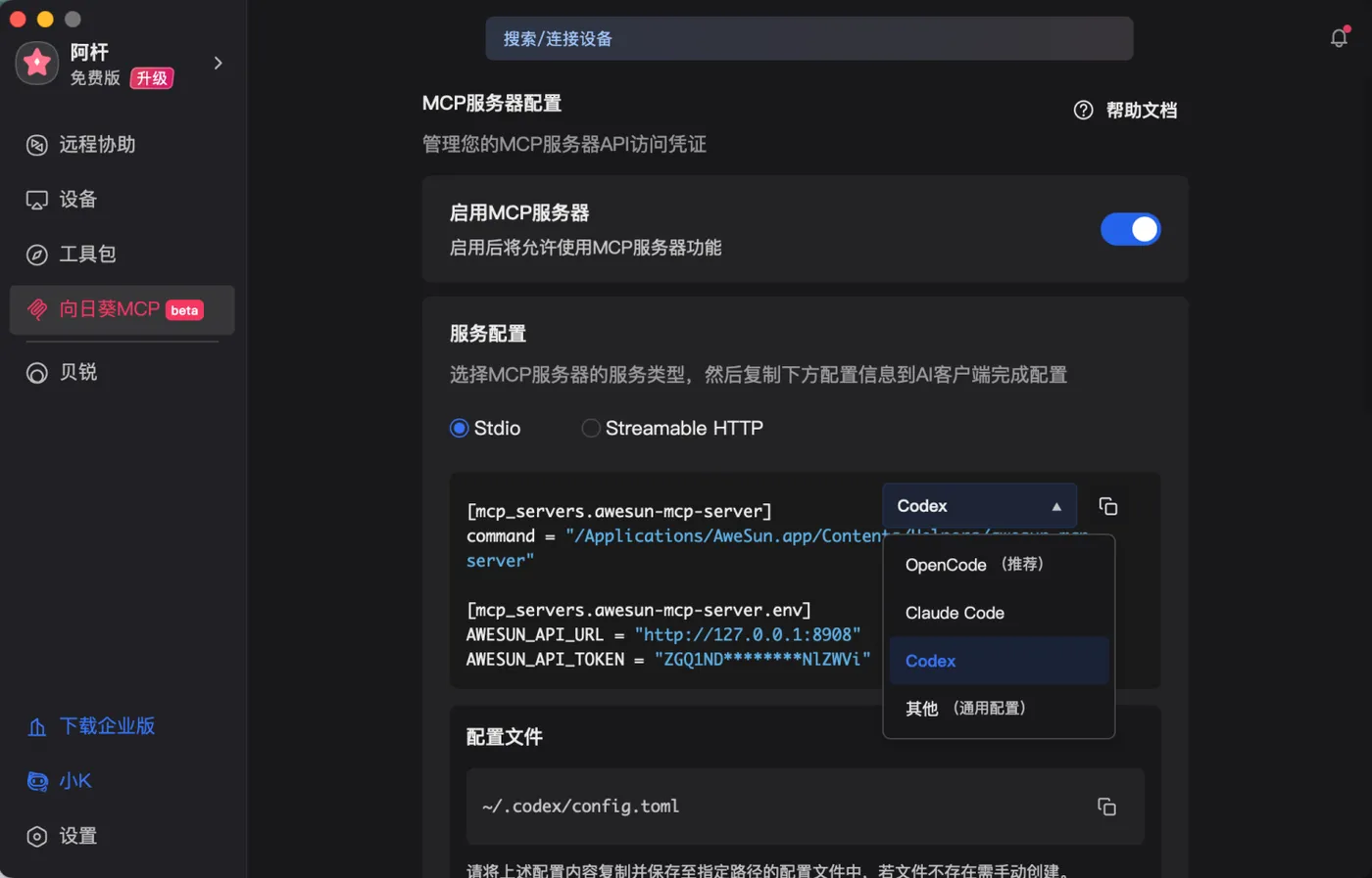 打开向日葵客户端,找到【向日葵MCP】,把「启用MCP服务器」打开。