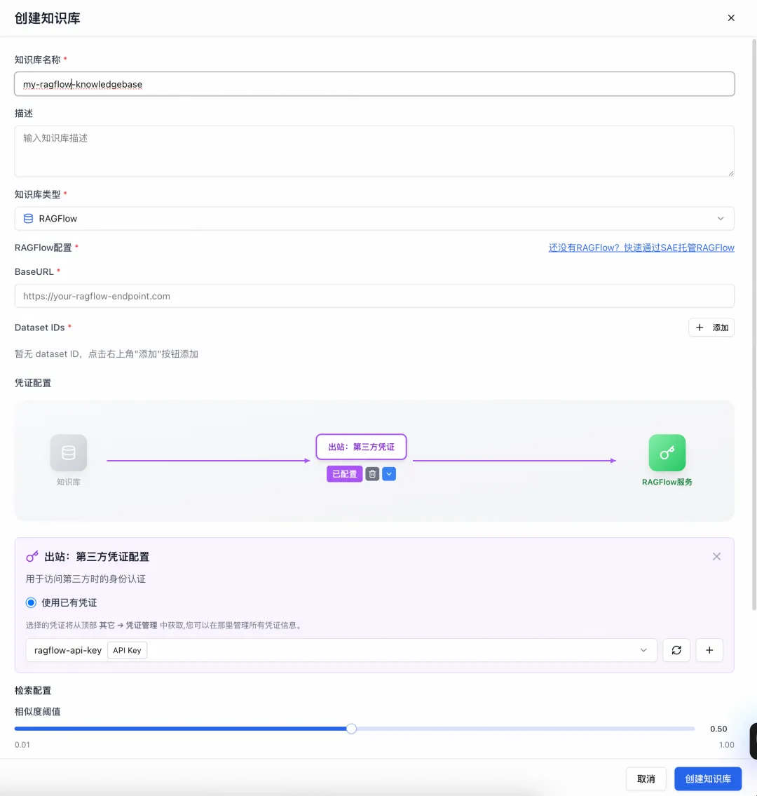 进入到创建页面,输入知识库名称、描述,选择知识库类型为“RAGFlow”,填写您已部署的 RAGFlow 的 BaseURL、Dataset IDs 和 API-KEY(将其保存在凭证中)。填写检索配置后,点击创建知识库,即可将您自建的 RAGFlow 知识库绑定至 AgentRun 平台。