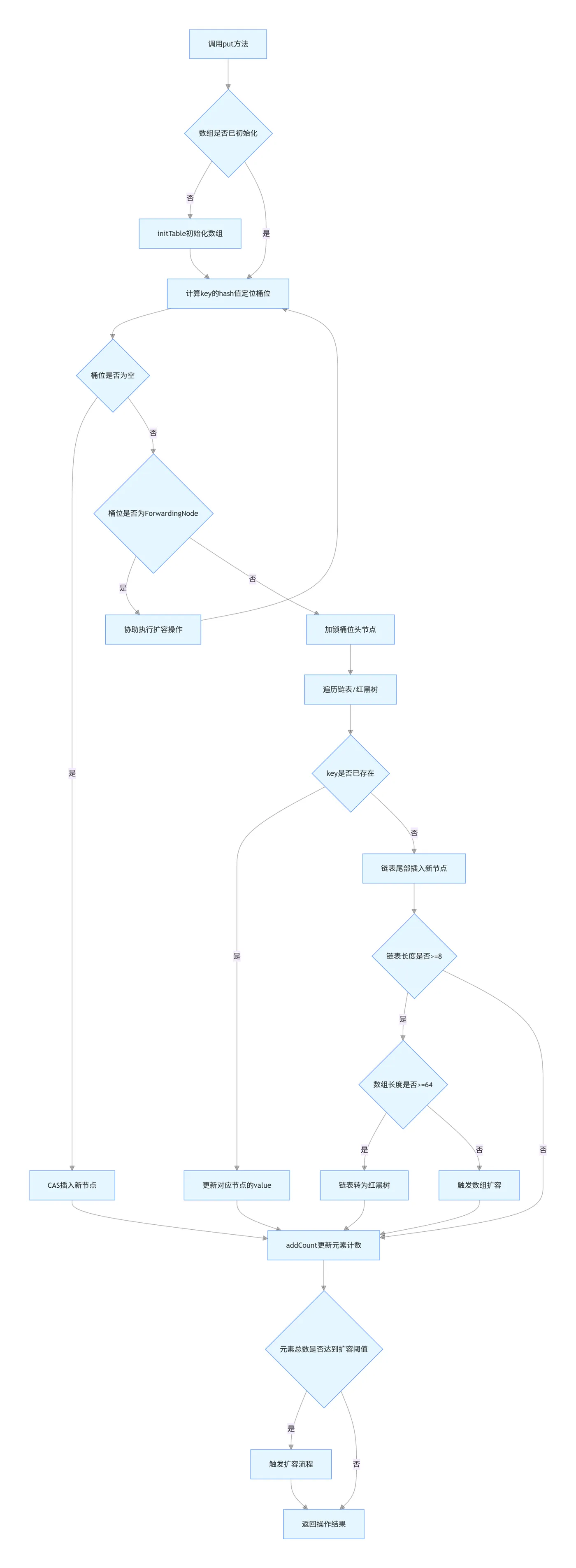- 加锁写入:如果桶位不为空且非扩容节点,用synchronized加锁桶位头节点,遍历链表或红黑树,key已存在则更新value,不存在则在链表尾部插入新节点。