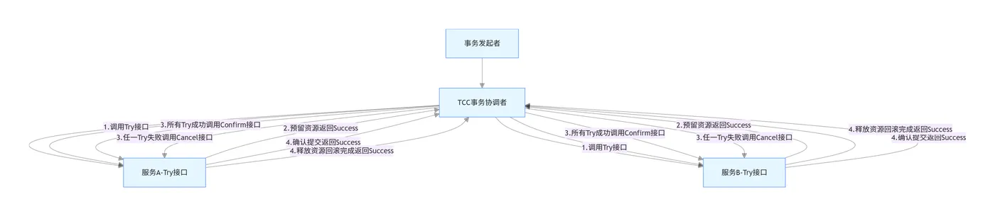 • 层级不同:2PC是资源层的两阶段提交,依赖底层数据库的XA支持;TCC是业务层的两阶段提交,完全由业务代码实现,不依赖底层资源。