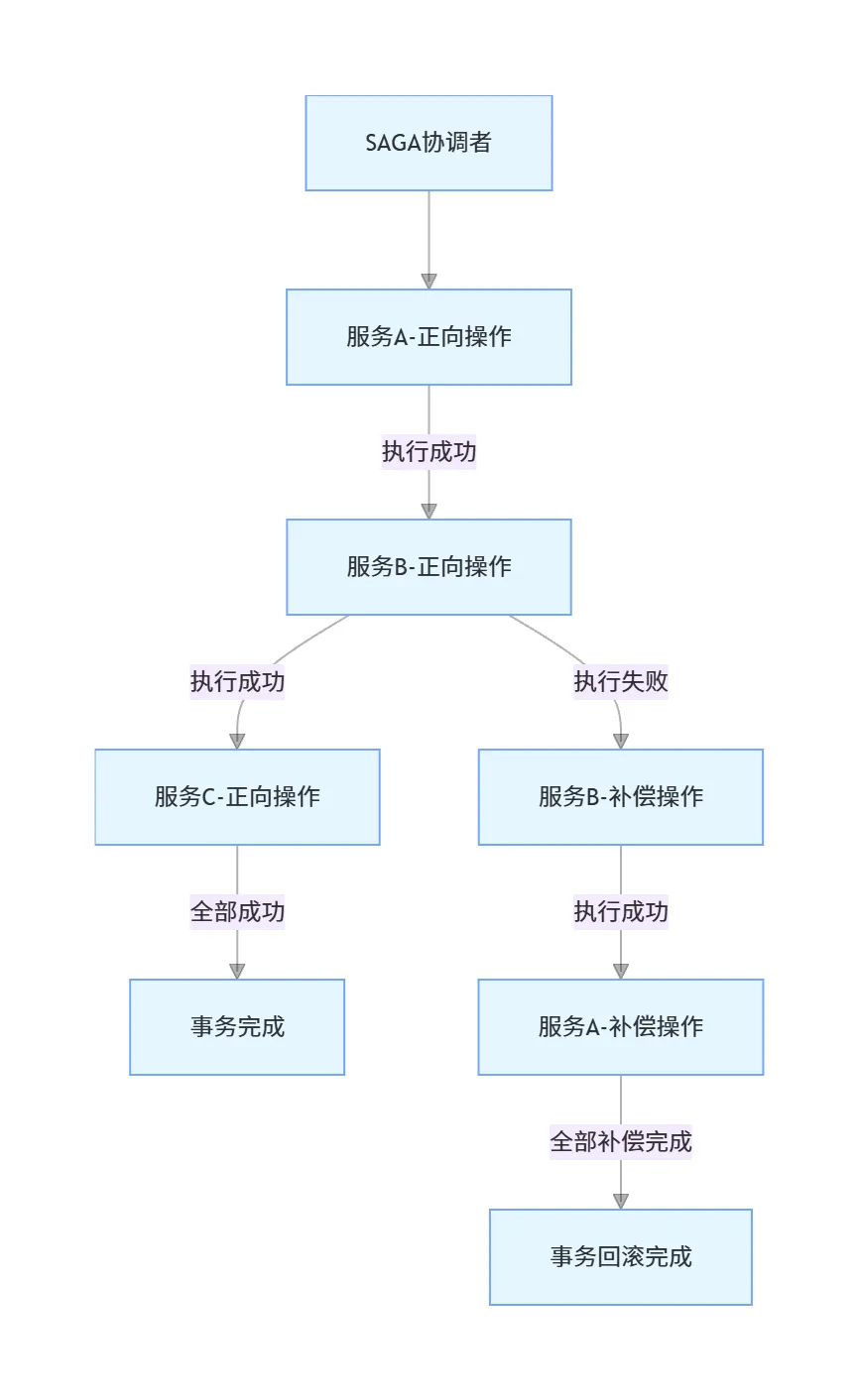 • 执行阶段不同:TCC是两阶段提交,有Try资源预留阶段;SAGA是一阶段直接执行正向操作,没有资源预留阶段,靠补偿实现回滚。