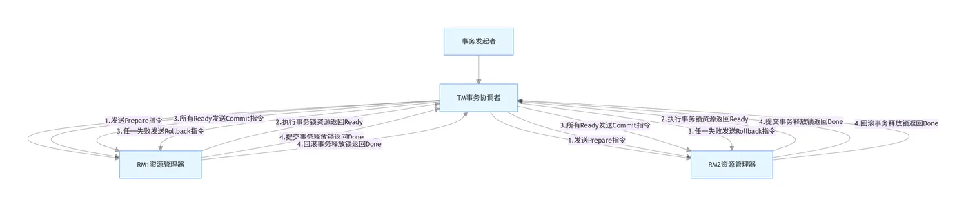 • 失败场景:只要有一个RM返回Abort状态,或者TM超时未收到某个RM的响应,TM立即向所有RM发送Rollback指令,每个RM根据undo日志回滚本地事务,释放锁定的资源,向TM返回Done状态,全局事务回滚完成。