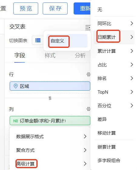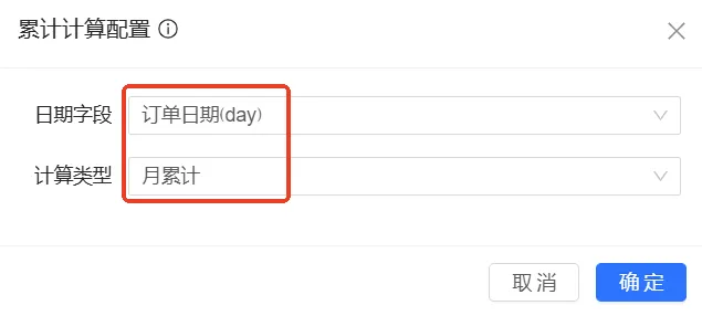 为订单金额字段配置日期累计以得到月累计订单金额。其中,因为需要以月维度查看累计订单金额,因此日期字段选择为订单日期(day),计算类型为月累计。