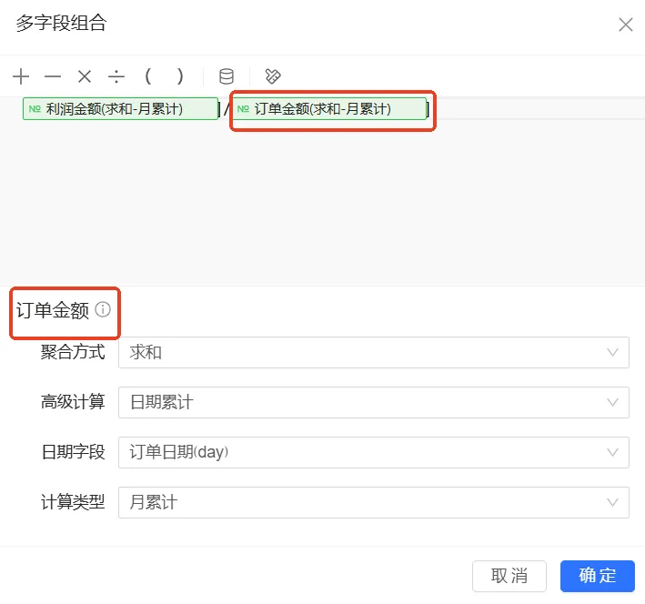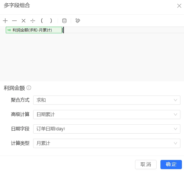 分别为订单金额字段、利润金额字段配置月累计计算,以在图表中直观查看到月维度的累计订单金额、累计利润金额。