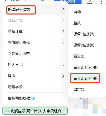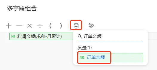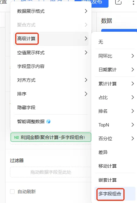点击交叉表第二个利润金额字段右侧的 图标,依次选择高级计算 > 多字段组合,在多字段组合弹窗中,根据已知计算公式完成以下配置。