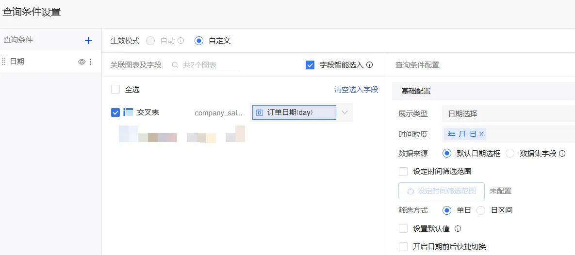 点击添加常规查询控件。将该控件与交叉表及订单日期(day)字段关联,将时间粒度设置为“年-月-日”,将筛选方式设置为“单日”。