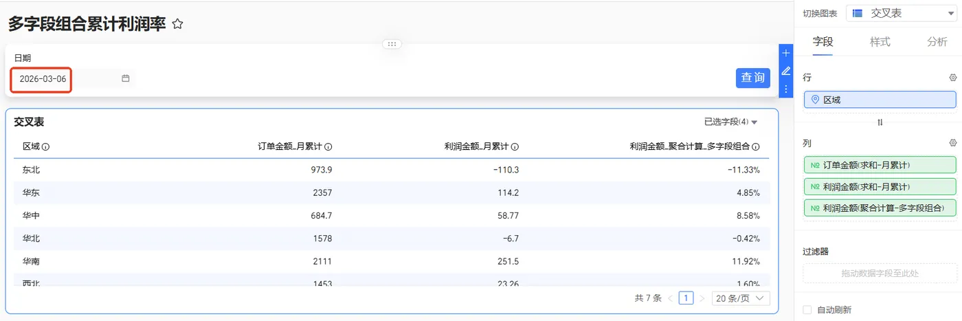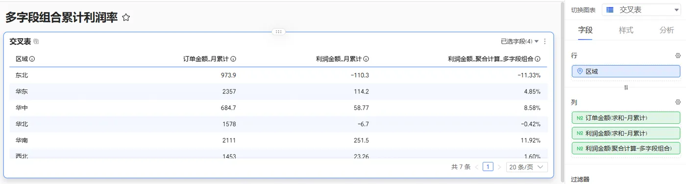 首先在交叉表中对度量字段使用日期累计 > 按月累计得出各区域的月累计利润金额、月累计订单金额,再将月累计利润除以月累计订单金额,最终得到累计利润率。具体配置说明如下: