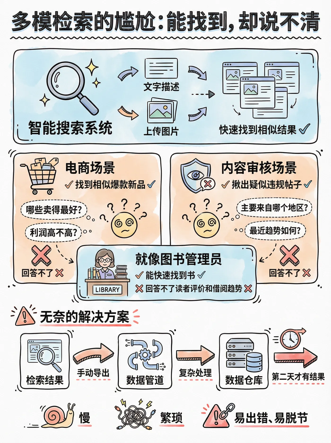 但问题来了。假设你是一家电商平台的运营人员,你用“以图搜图”找到了一批和爆款商品风格相似的新品。老板马上会问你:“这批新品里,哪些卖得最好?利润高不高?” 或者,如果你在做内容审核,系统帮你揪出了一批疑似违规的帖子,领导接着就会想知道:“这些帖子主要来自哪个地区?最近一周是变多了还是变少了?”