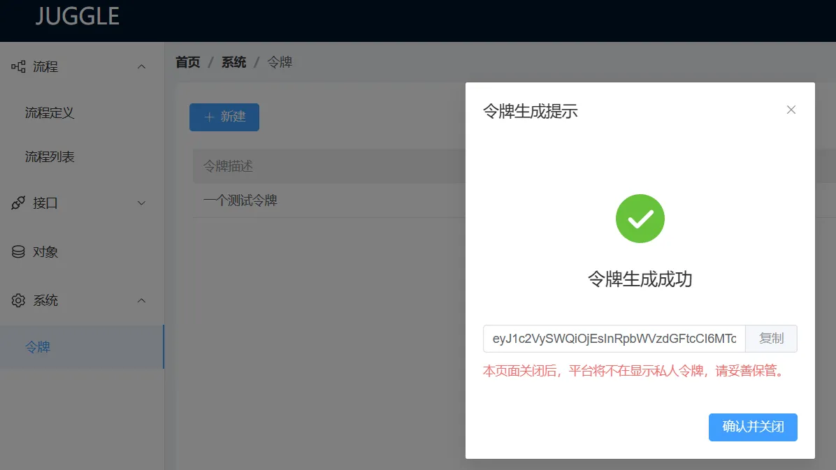 juggle skill在运行的时候会依赖两个两个环境变量,分别是juggle服务部署的域名和流程访问的认证令牌,认证令牌的创建方式如下图所示
