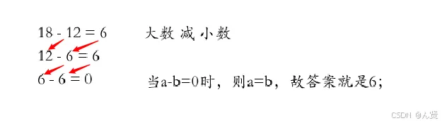 * 原理: 两个正整数 a 和 b(a > b)的最大公约数等于 b 和 a - b 的最大公约数
