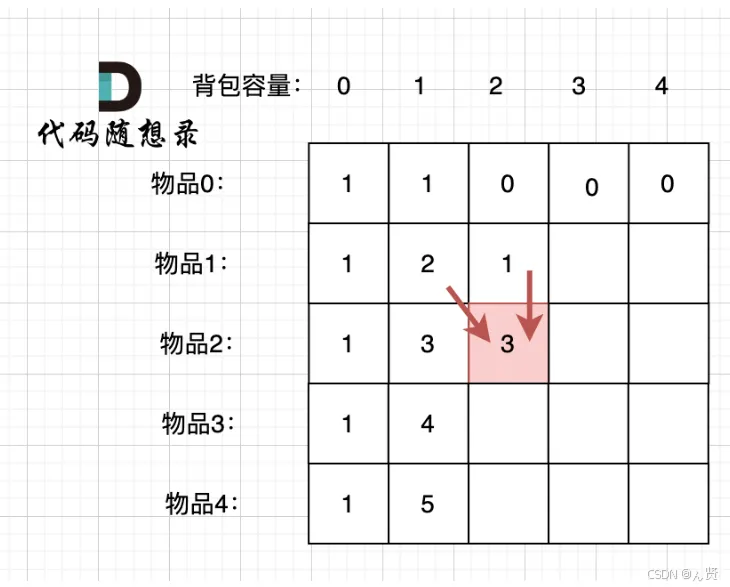 dp[i−1][j]; - 装入第i件物品(前提是能装下),即dp[i-1][j-weight[i]]+value[i]。