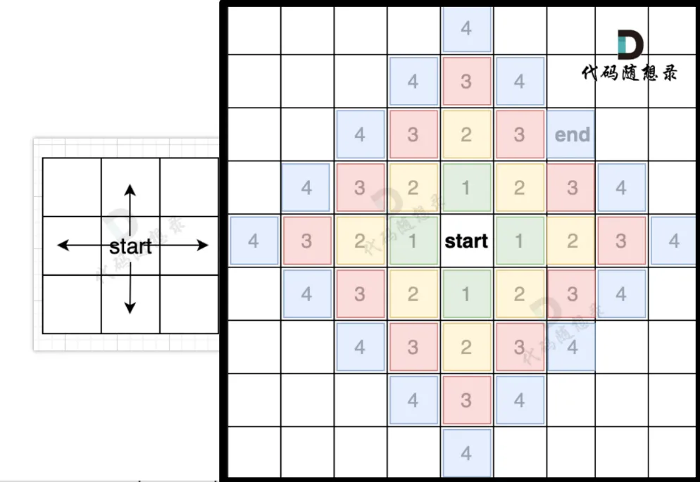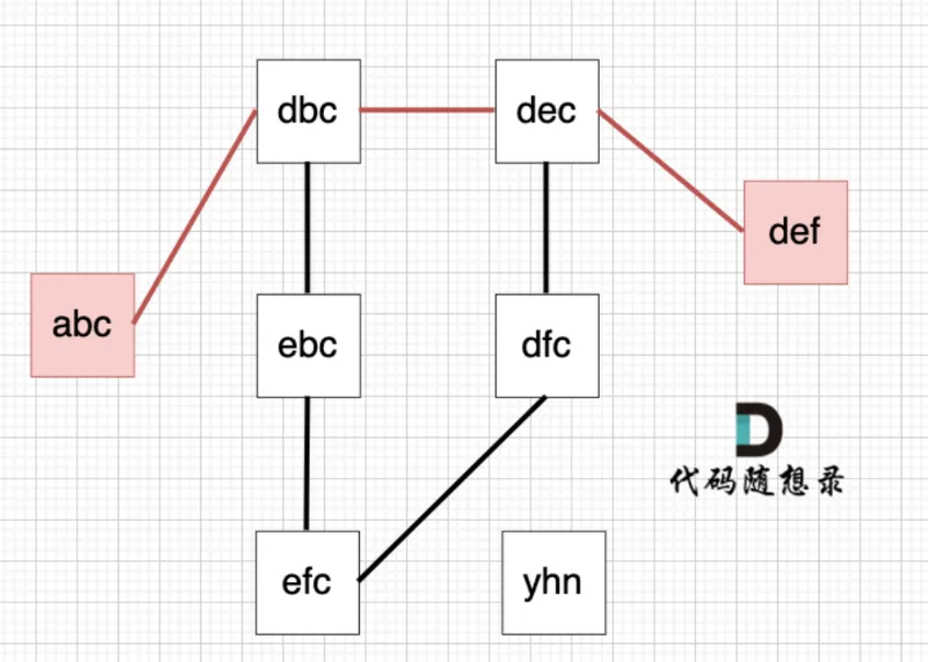从 startStr 到 endStr,在 strList 中最短的路径为 abc -> dbc -> dec -> def,所以输出结果为 4