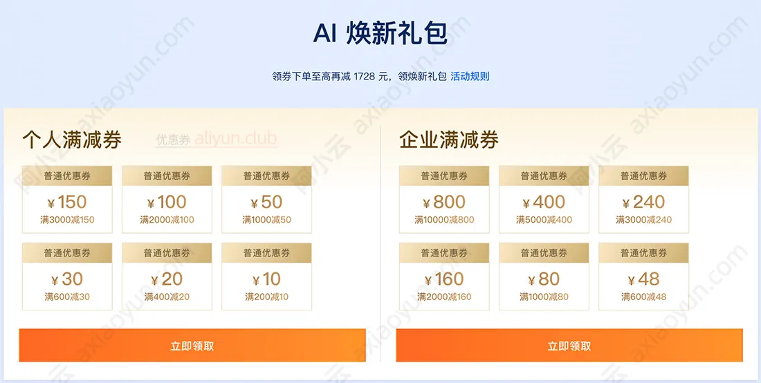 阿里云优惠券领取入口目前有4个,可以在2026年最新的AI焕新季、云小站领取个人和企业专属代金券,学生专属优惠,企业上云补贴以及活动中心: