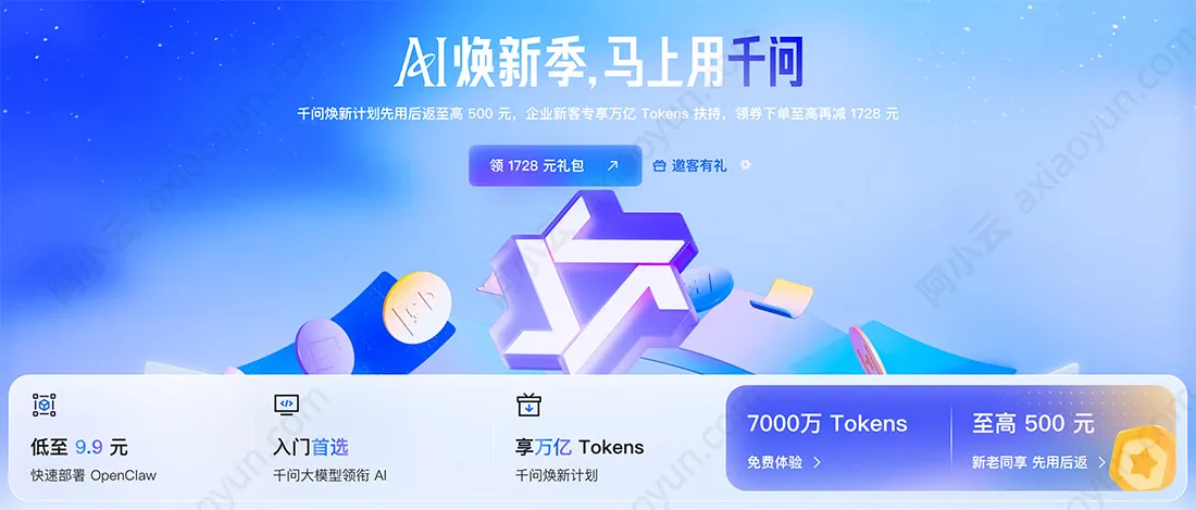 阿里云官方活动:https://www.aliyun.com/activity/purchase/aistartup 这个活动上可以免费领取代金券,千问焕新计划先用后返至高500元,企业新客专享万亿Tokens扶持,领券下单至高再减1728元,如下图: