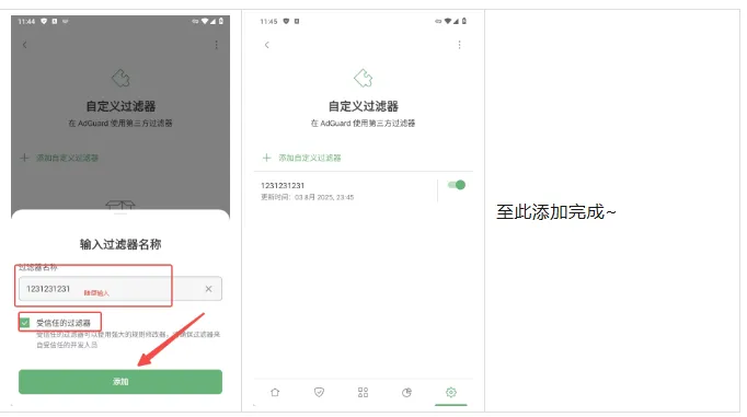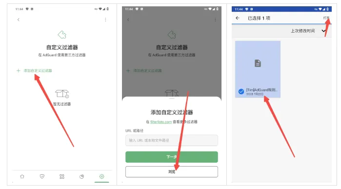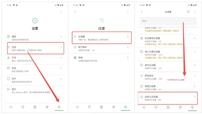 导入指南:设置→过滤→过滤器→自定义过滤器→添加自定义过滤器→将URL或者本地文件导入,如图