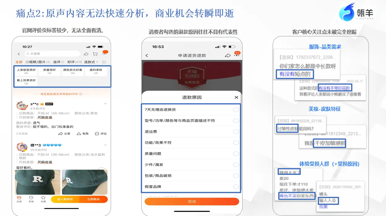 • 多维度原声收录:无论是商品详情页的深度评价、客服窗口的即时咨询,还是“问大家”中的互动讨论、退款理由的描述,均能被完整捕获。
