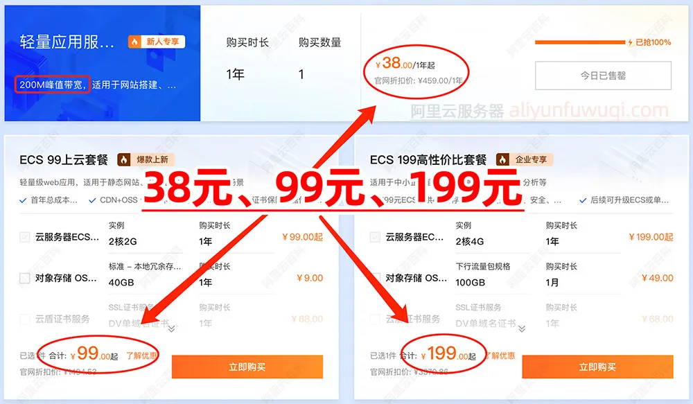 阿里云服务器2026最新价格38元、68元、99元和199元配置对比详细介绍,包括轻量应用服务器和云服务器ECS,个人用户和企业用户都有选择,目前是阿里云的爆款云服务器,建议人手一台,38元是200M峰值带宽的轻量应用服务器,99元是云服务器ECS,199元服务器是企业专享的2核4G、5M带宽、80G系统盘,阿小云整理阿里云服务器38元、68元、99元和199元费用价格及配置详解: