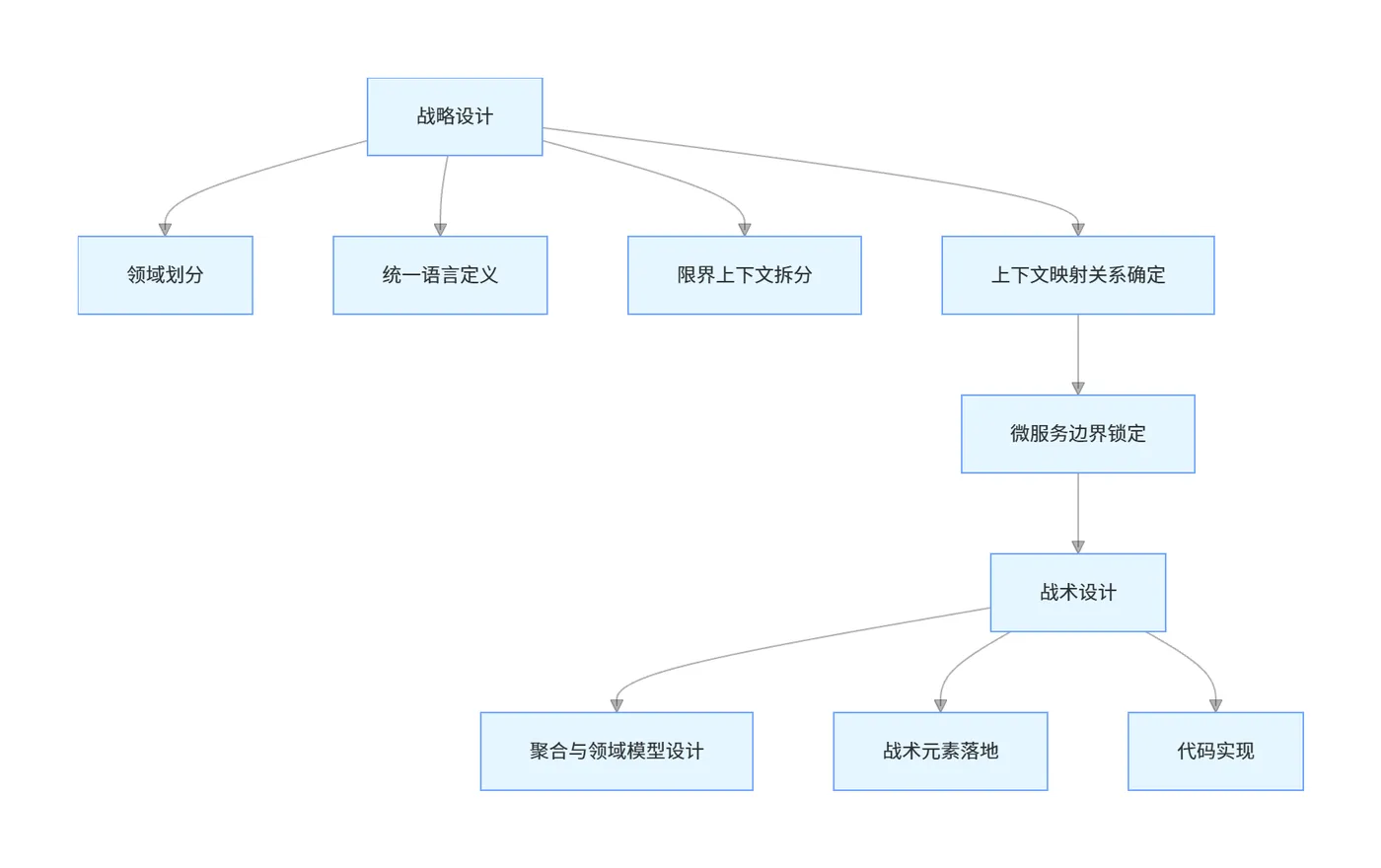 1. 战略设计:定边界。从全局业务视角出发,划分业务领域、定义统一语言、拆分限界上下文,最终确定微服务的拆分边界。这是DDD的核心,也是微服务拆分成败的关键。