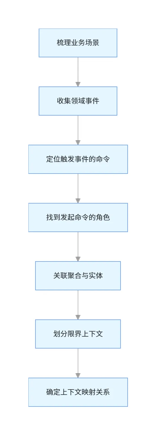 6. 划分限界上下文:把语义和业务紧密相关的聚合、事件、命令,放到同一个限界上下文里。划分的核心原则是高内聚、低耦合:同一个上下文内的业务逻辑高度相关,上下文之间的依赖尽量少。