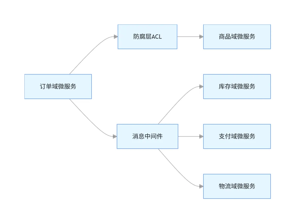 2. 防腐层(Anticorruption Layer,ACL):客户方上下文在自己的域内,定义一套适配接口,把供应方的接口模型转换成自己的领域模型,隔离供应方的变化。即使供应方的接口改了,只需要修改防腐层的适配逻辑,不需要修改自己的核心业务代码。这是跨微服务调用最常用的模式,能最大程度保证自己域的稳定性。