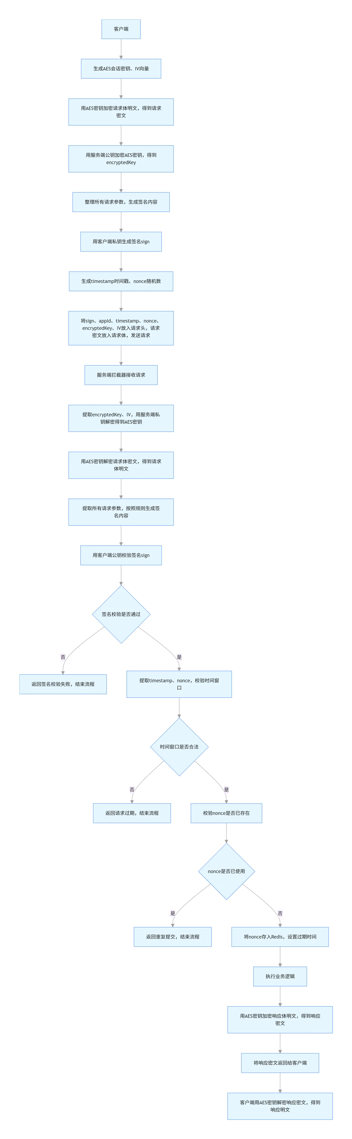 这里的核心逻辑是:私钥只有客户端自己持有,任何人都无法伪造出能被对应公钥验证通过的签名,同时只要参数有任何篡改,生成的摘要就会不一致,签名校验必然失败。