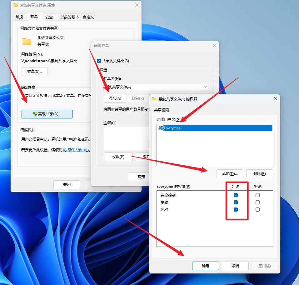 右键点 总共享文件夹目录 → 属性 → 共享 → 高级共享 勾选: 共享此文件夹 → 确定