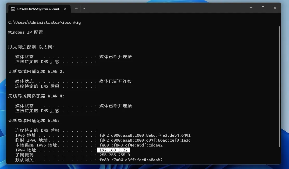 我们可以使用快捷键 Win+R 输入 cmd 回车输入 ipconfig