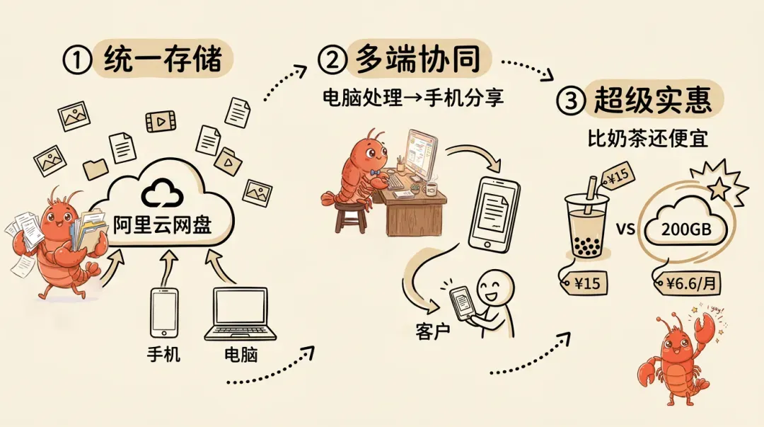 而与此同时,阿里云网盘企业版依然保持极致性价比:阿里云网盘企业版,200GB 空间仅需 ¥6.6 / 月,包含:文件存储、多端同步、在线预览(图片/视频/PDF等),OpenClaw 专属 Skill 接入。