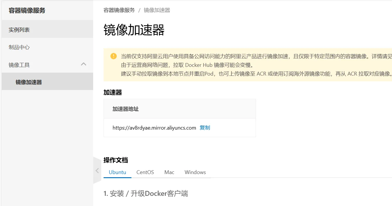 # 创建目录 mkdir -p /etc/docker # 复制内容,注意把其中的镜像加速地址改成你自己的 tee /etc/docker/daemon.json <<-'EOF' { "registry-mirrors": ["https://xxxx.mirror.aliyuncs.com"] } EOF # 重新加载配置 systemctl daemon-reload # 重启Docker systemctl restart docker