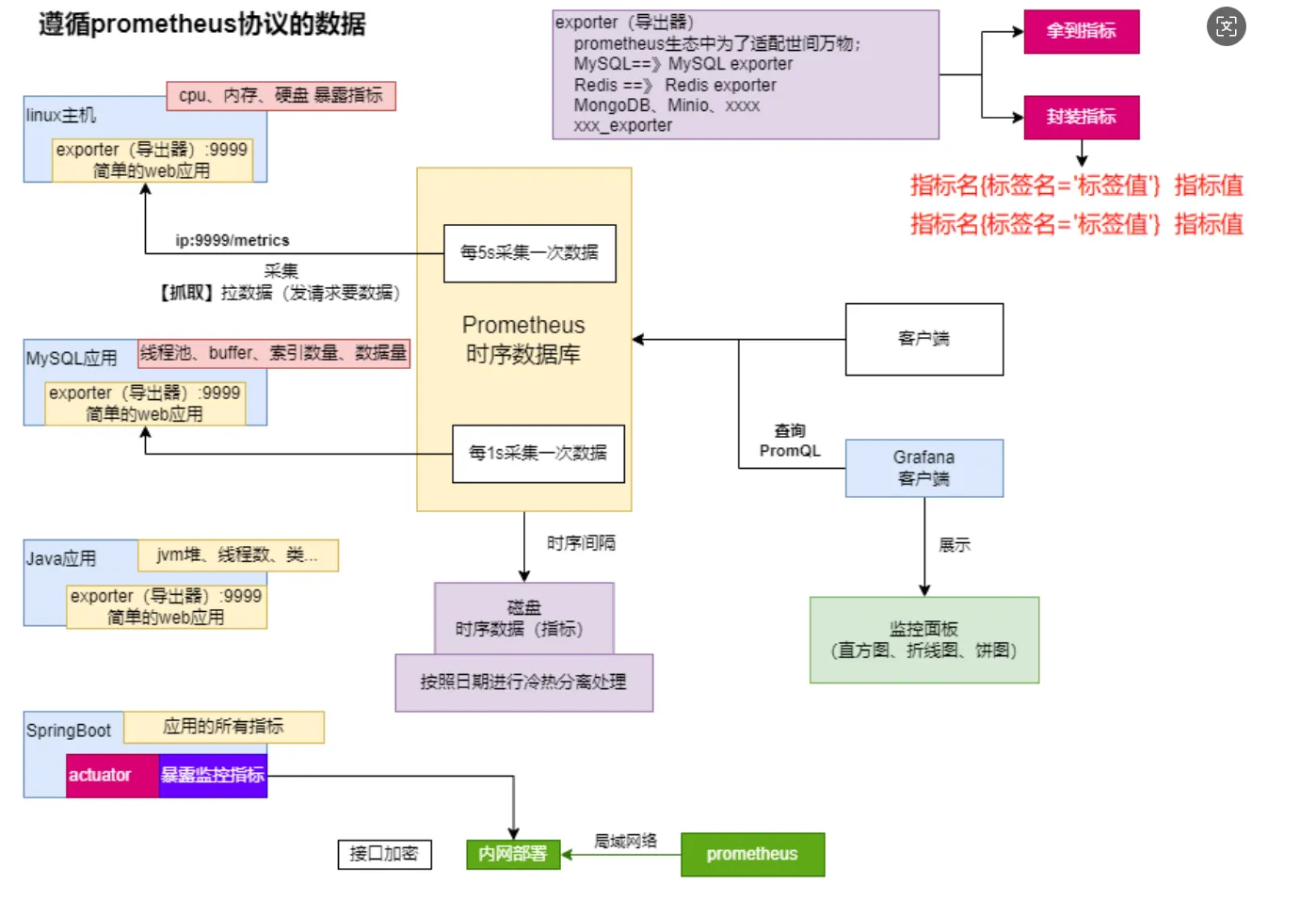 应用服务通过导出器暴露自己的指标,Prometheus定时去拉取导出器暴露的数据,然后数据会持久化落盘做时序数据库存储,客户端如Grafana会通过PromQL查询Prometheus中的指标数据。exporter导出器相当于一个Web应用,遵循Prometheus协议,导出器完成两件事:拿到指标,然后封装指标。