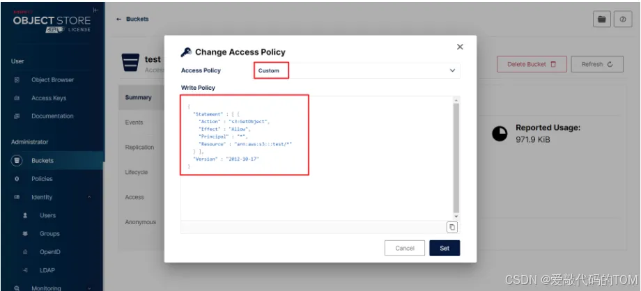例如以下JSON字符串表达的含义是:允许(Allow)所有人(*)读取(s3:GetObject)指定桶(test)的所有内容。