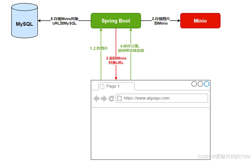 @Override public String upload(MultipartFile file) throws ServerException, InsufficientDataException, ErrorResponseException, IOException, NoSuchAlgorithmException, InvalidKeyException, InvalidResponseException, XmlParserException, InternalException{ boolean bucketExists = minioClient.bucketExists( BucketExistsArgs.builder() .bucket(properties.getBucketName()) .build()); if (!bucketExists) { minioClient.makeBucket( MakeBucketArgs.builder() .bucket(properties.getBucketName()) .build()); minioClient.setBucketPolicy( SetBucketPolicyArgs.builder() .bucket(properties.getBucketName()) .config(createBucketPolicyConfig(properties.getBucketName())) .build()); } String filename = new SimpleDateFormat("yyyyMMdd").format(new Date()) + "/" + UUID.randomUUID() + "-" + file.getOriginalFilename(); minioClient.putObject( PutObjectArgs.builder() .bucket(properties.getBucketName()) .stream(file.getInputStream(), file.getSize(), -1) .object(filename) .contentType(file.getContentType()) .build()); return String.join("/",properties.getEndpoint(),properties.getBucketName(),filename); } Controller层代码 public Result<String> upload(@RequestParam MultipartFile file) { try { String url = service.upload(file); return Result.ok(url); } catch (Exception e) { e.printStackTrace(); return Result.fail(); } }