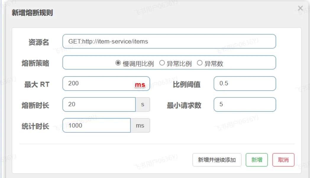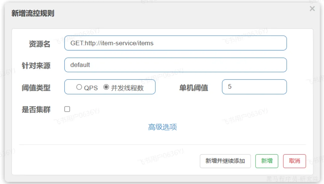 注意,这里勾选的是并发线程数限制,也就是说这个查询功能最多使用5个线程,而不是5QPS。如果查询商品的接口每秒处理2个请求,则5个线程的实际QPS在10左右,而超出的请求自然会被拒绝。