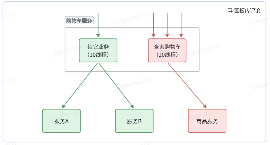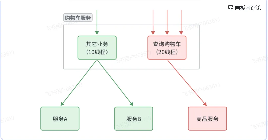 比如,查询购物车的时候需要查询商品,为了避免因商品服务出现故障导致购物车服务级联失败,我们可以把购物车业务中查询商品的部分隔离起来,限制可用的线程资源: