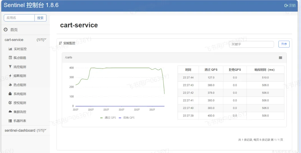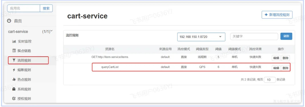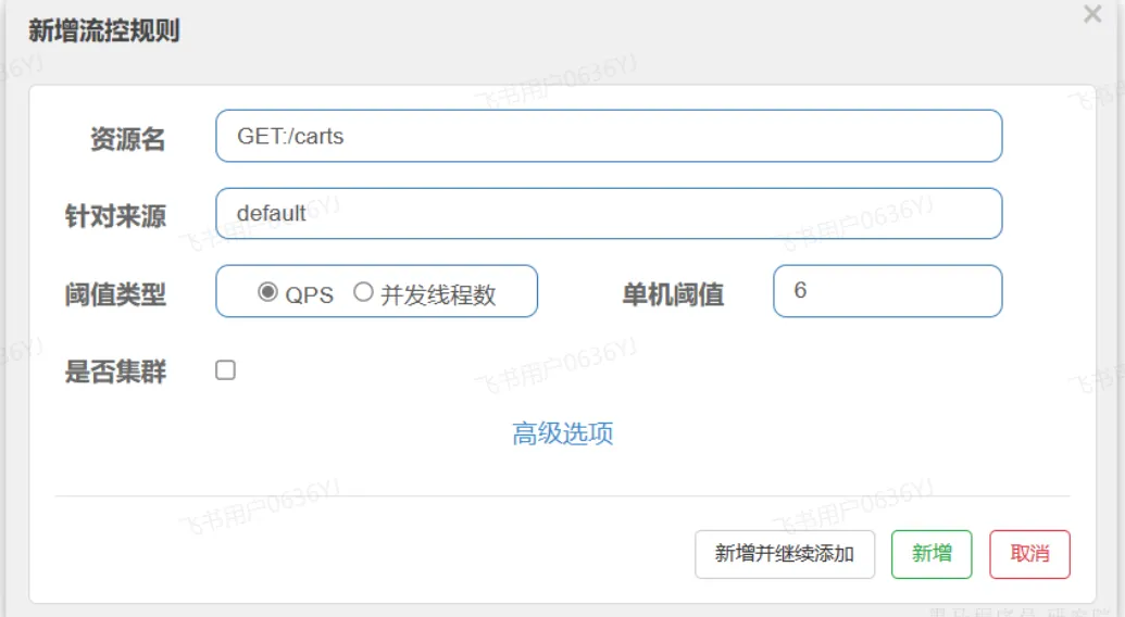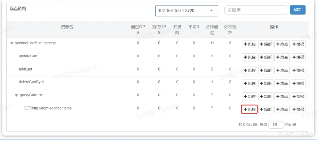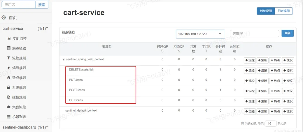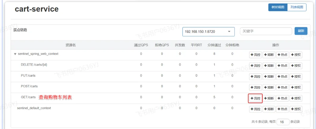 这样就把查询购物车列表这个簇点资源的流量限制在了每秒6个,也就是最大QPS为6.