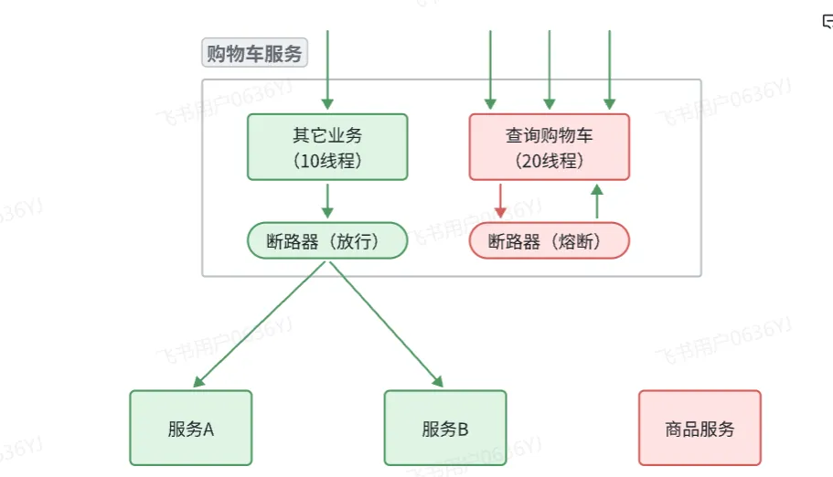 这样,即便商品服务出现故障,最多导致查询购物车业务故障,并且可用的线程资源也被限定在一定范围,不会导致整个购物车服务崩溃。